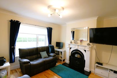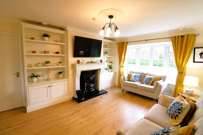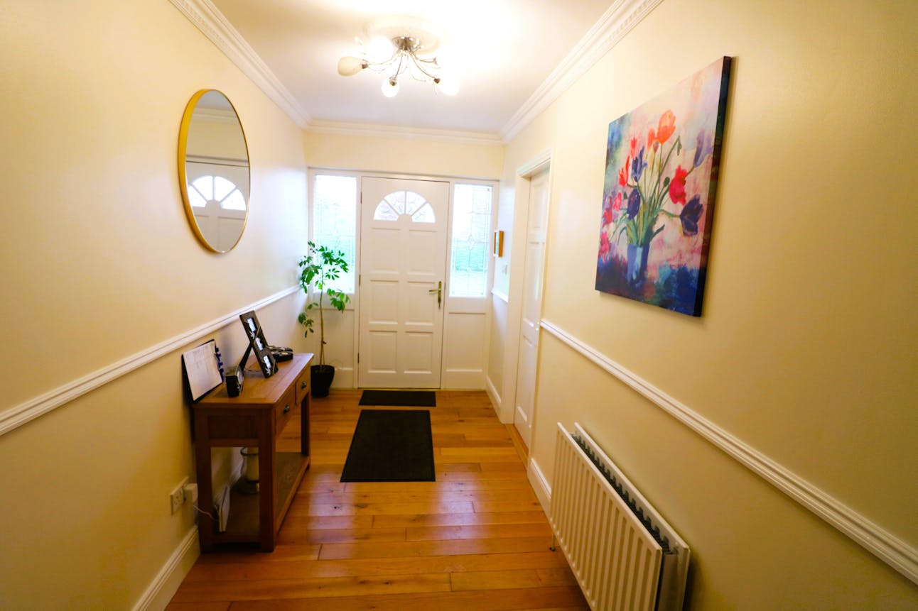 - Entrance hall, sitting room, and open-plan kitchen/living area.